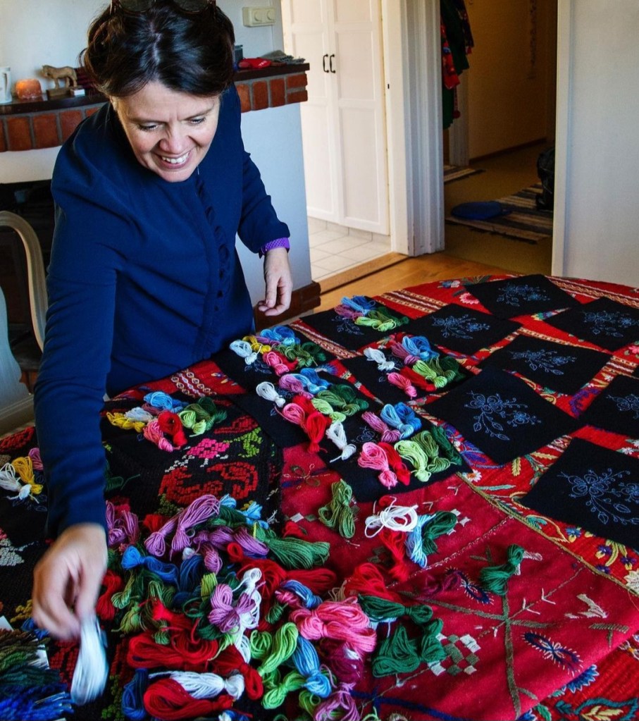 Nedan: Anna-Karin i sitt arbete som brodös och kursledare. Foto: Privat.